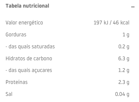 Legumes* 64,5% [batata* (29,5%), cenoura*, curgete*, feijão verde*, alho francês*], água de cozedura, ervilhas* 10,5%,bacalhau 10% e azeite virgem extra*. *Proveniente de agricultura biológica.