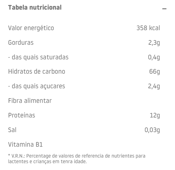 Farinha de cereais* 99.9% (Trigo*, espelta* integral, trigo sarraceno*, aveia*, sémola de milho*, farinha de quinoa*, farinha de arroz*), vitamina B1. *Proveniente de agricultura biológica.