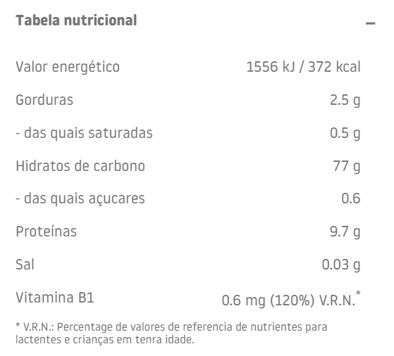 Farinha de trigo sarraceno*, arroz* (flocos e farinha), semolina de milho*, farinha de quinoa* 10%. *Proveniente de agricultura biológica. Sem açúcares adicionados. Contém açúcares naturalmente presentes.