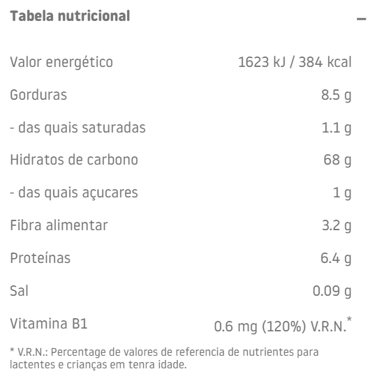Sêmola de milho* (94%), azeite extra virgem* (6%), vitamina B1. *Proveniente de agricultura biológica. Contém açúcares naturalmente presentes.